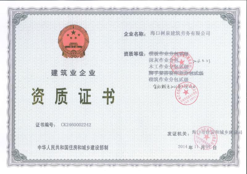 ??跇淙ㄖ趧沼邢薰境闪⒂?011年,公司位于???,其前身是一家專業建筑施工隊,自2004年即開始在海南從事建筑勞務施工。自成立至今,公司已經擁有一支科學管理、質量過硬、能打硬仗,搶工期的專業隊伍。能獨立承擔大中型工業與民用建筑 、室內外裝修、各類機電設備安裝工程。代表工程有海口濱海華庭、三亞時代海岸T01/02/04/05棟高層、合肥東?;▓@二期、陵水富力灣B區高層、三亞金中海(酒店)、瓊海大印經典花園、??诃h球海景大酒店(四星級酒店,在建中)、陵水珍珠大廈(五星酒店)、海口萬達廣場、美蘭機場二期。